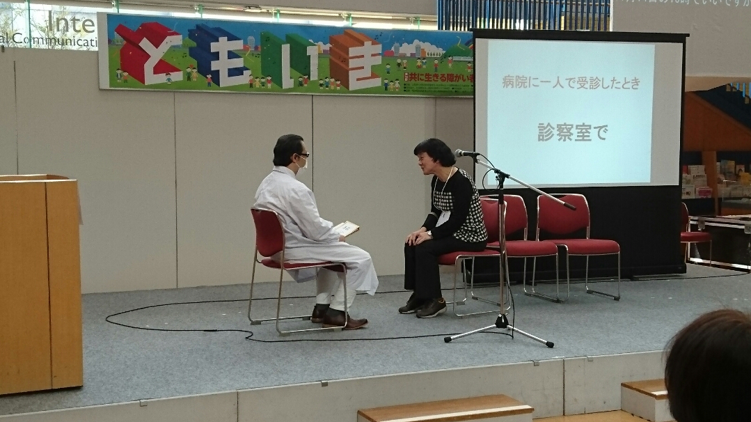 舞台ではプレゼンテーションを、ブースでは聞こえの相談窓口、難聴と要約筆記利用の体験のコーナーなどを設けました。20分のプレゼンテーションの寸劇では「難聴者の或る日の1コマ」を演じました。難聴者が1人で受診すると聞こえが不自由なことでいろいろな不便が生じ、スムーズに行かず、大変な思いをする。しかし、要約筆記者同行ならば聞こえの不便を感じることなくスムーズに受診できることを見ていただきました。そして、要約筆記者同行でなくとも、周りの人の話し方や筆談、身振りなどの配慮により、不便さが軽減する。ぜひ配慮をお願いしたい、と呼びかけました。