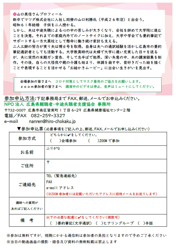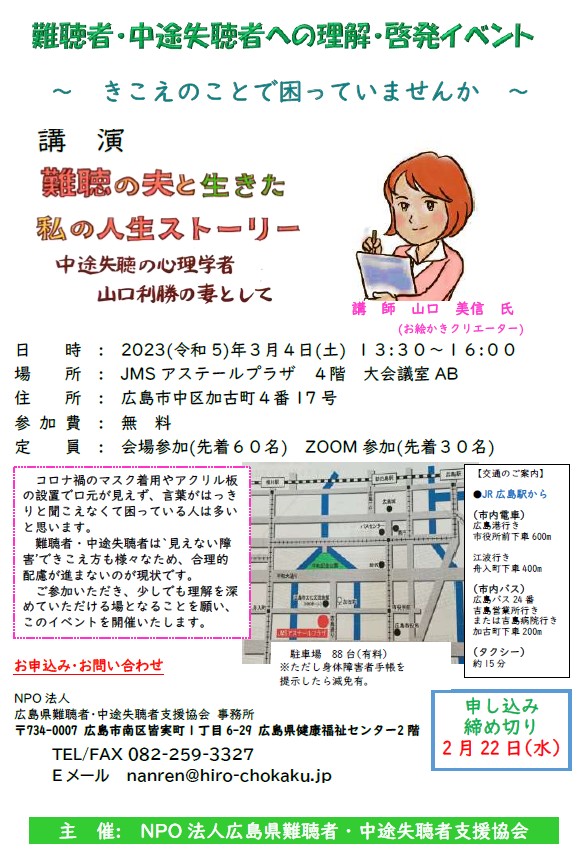 3/4(土)講演:難聴の夫と生きた私の人生ストーリー「中途失聴の心理学者 山口利勝の妻として」のお知らせ 協会関連 2023.02.162025.07.15 難聴者・中途失聴者への理解・啓発イベントのお知らせ 講演:難聴の夫と生きた私の人生ストーリー「中途失聴の心理学者 山口利勝の妻として」 講師:山口 美信氏(お絵かきクリエーター) 日 時:3月4日 13:30~16:00 場 所:JMSアステールプラザ4階 大会議室 AB 住 所:広島市中区加古町4番17号 参加費無料 定員:会場参加(60名) Zoom参加(30名) お申込み:TEL/FAX 082-259-3327 Eメール nanren@hiro-chokaku.jp