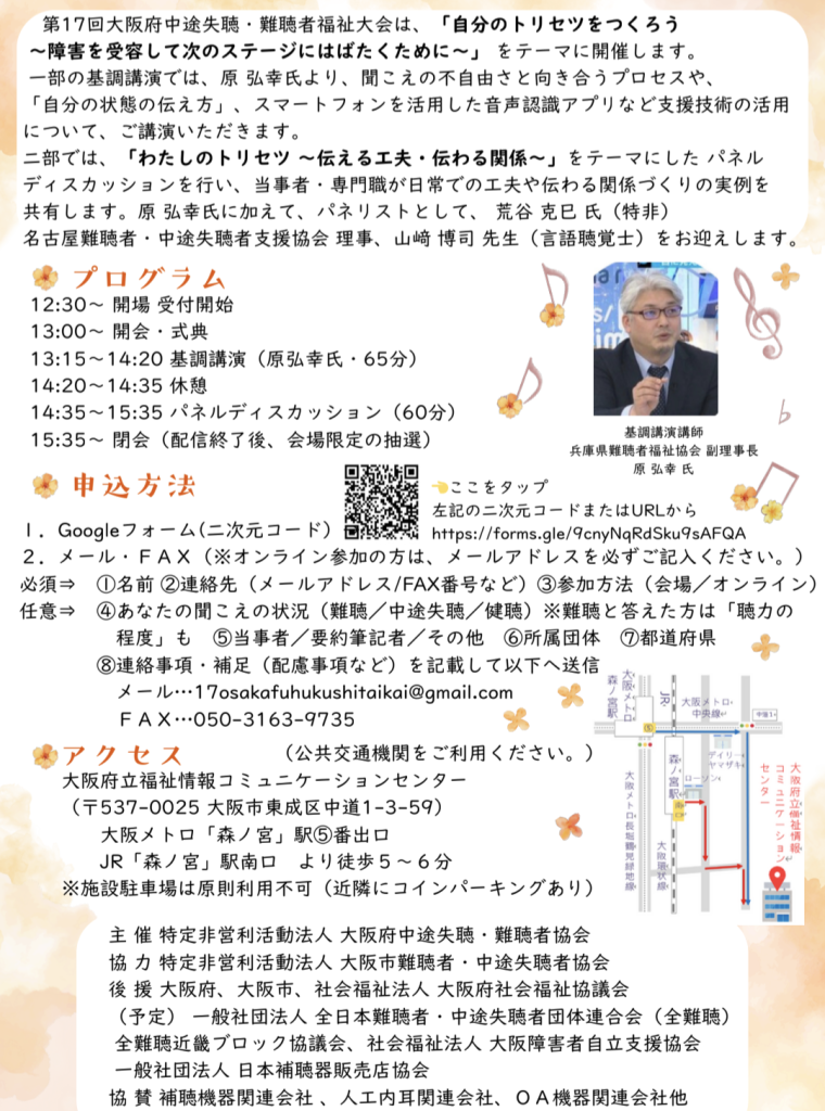 詳細は添付の第18回大阪府中途失聴・難聴者福祉大会チラシ裏面をご覧ください。